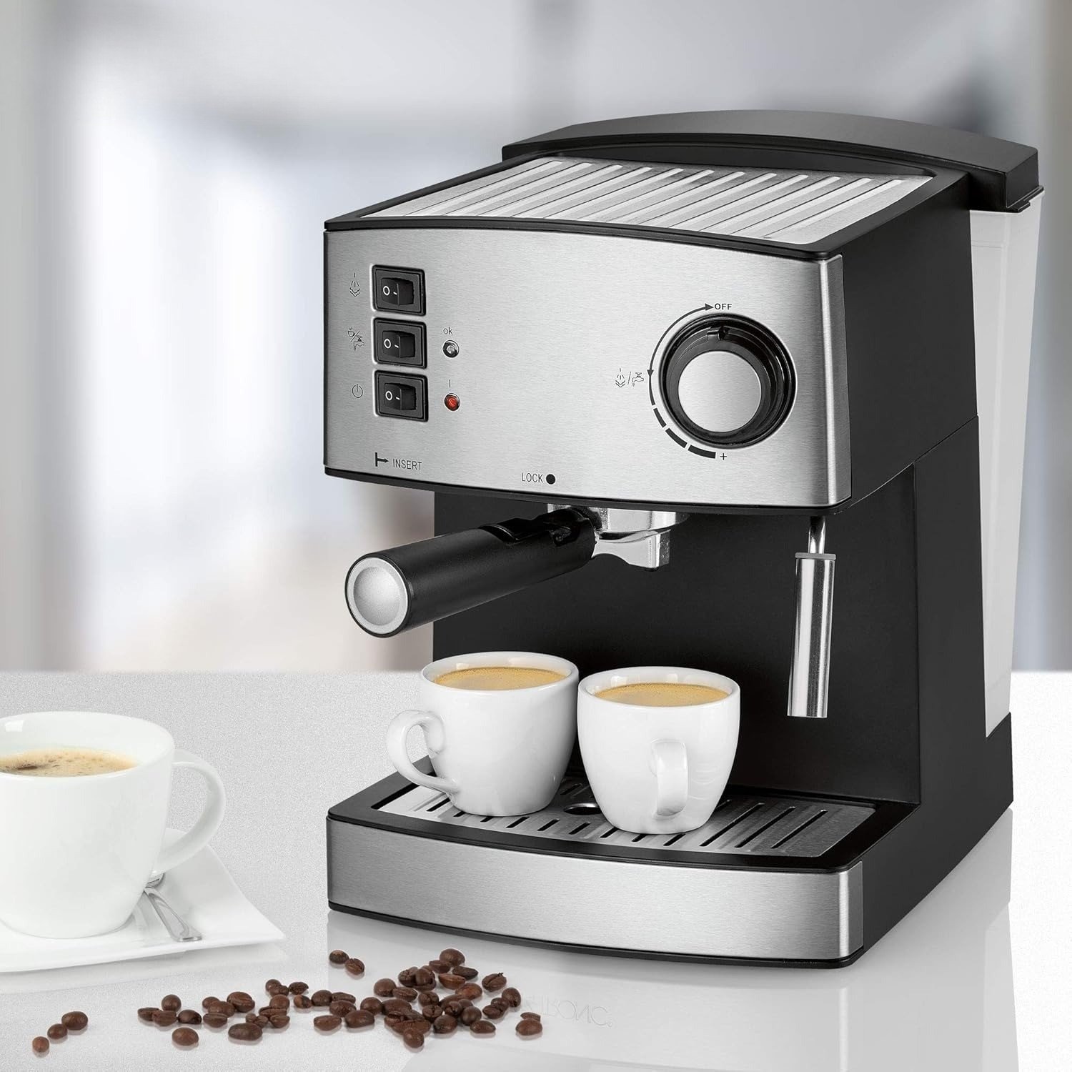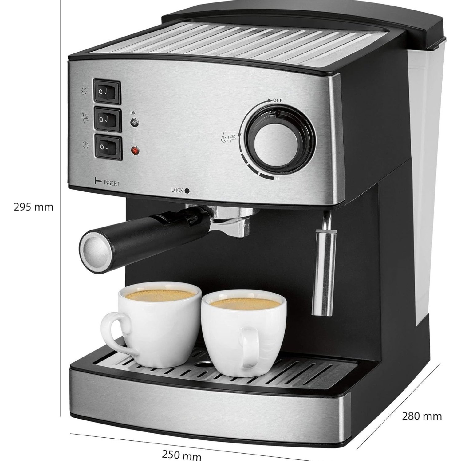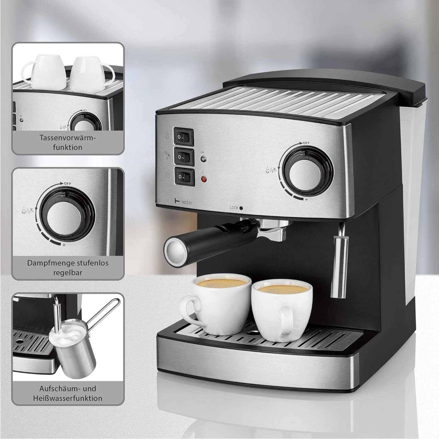 Third Paragraph Der Komfort steht bei diesem Modell im Vordergrund. Der großzügige 1,6 Liter Wassertank ist transparent und abnehmbar, was das Befüllen und die Reinigung erheblich erleichtert. Eine praktische Tassenvorwärmfunktion sorgt dafür, dass Ihr Espresso nicht sofort abkühlt, und die außenliegende Wasserstandsanzeige gibt Ihnen jederzeit volle Kontrolle über die Kapazität.